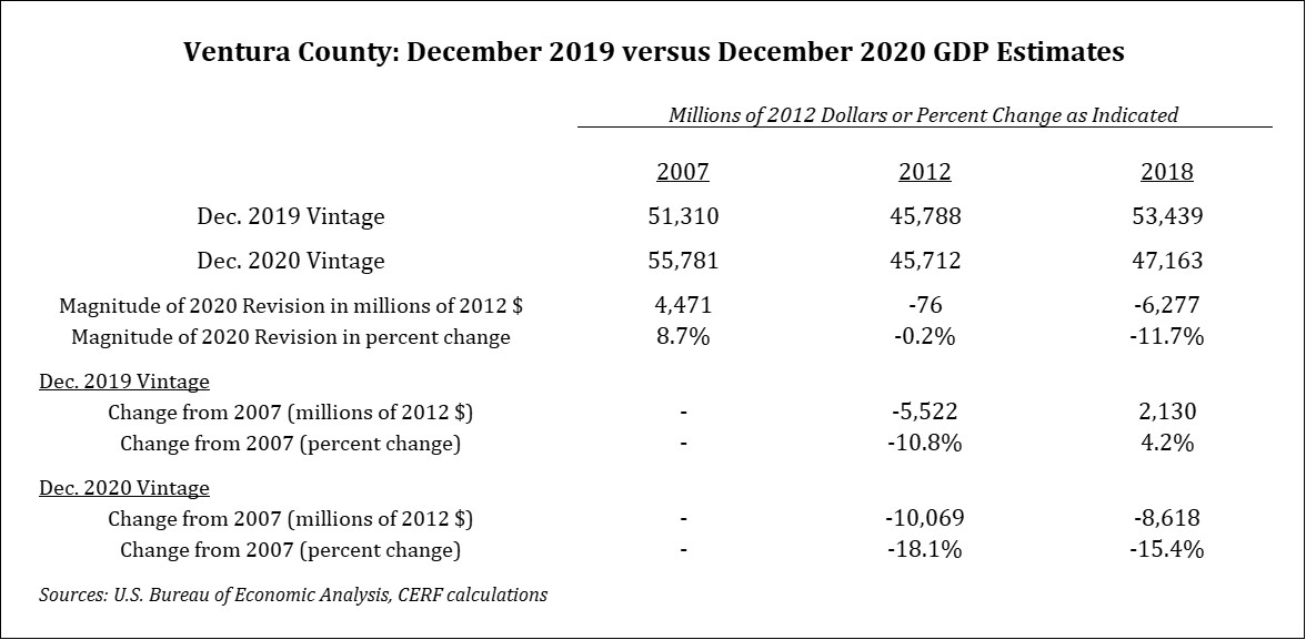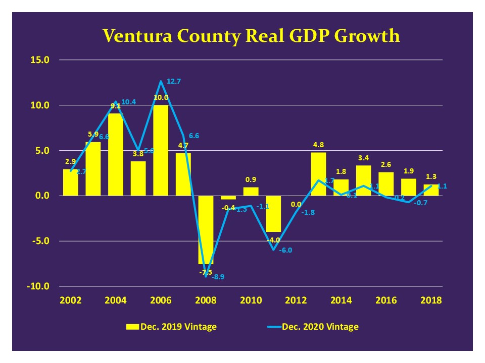 According to revised data, while the U.S. economy expanded continuously from July 2009 until February 2020, Ventura County’s economy contracted continuously from 2007 to 2012, and contracted again from 2015 to 2017. The magnitude of the economic decline from 2007 to 2012 was relatively large at $10 billion dollars or 18 percent, while the magnitude of the 2015 to 2017 contraction was small, at $0.4 billion dollars. I also note that the revised data indicate that the County’s 2001 to 2007 compound annual growth rate was higher than previously estimated, at 7.3 percent compared to the old estimate of 6.1 percent.